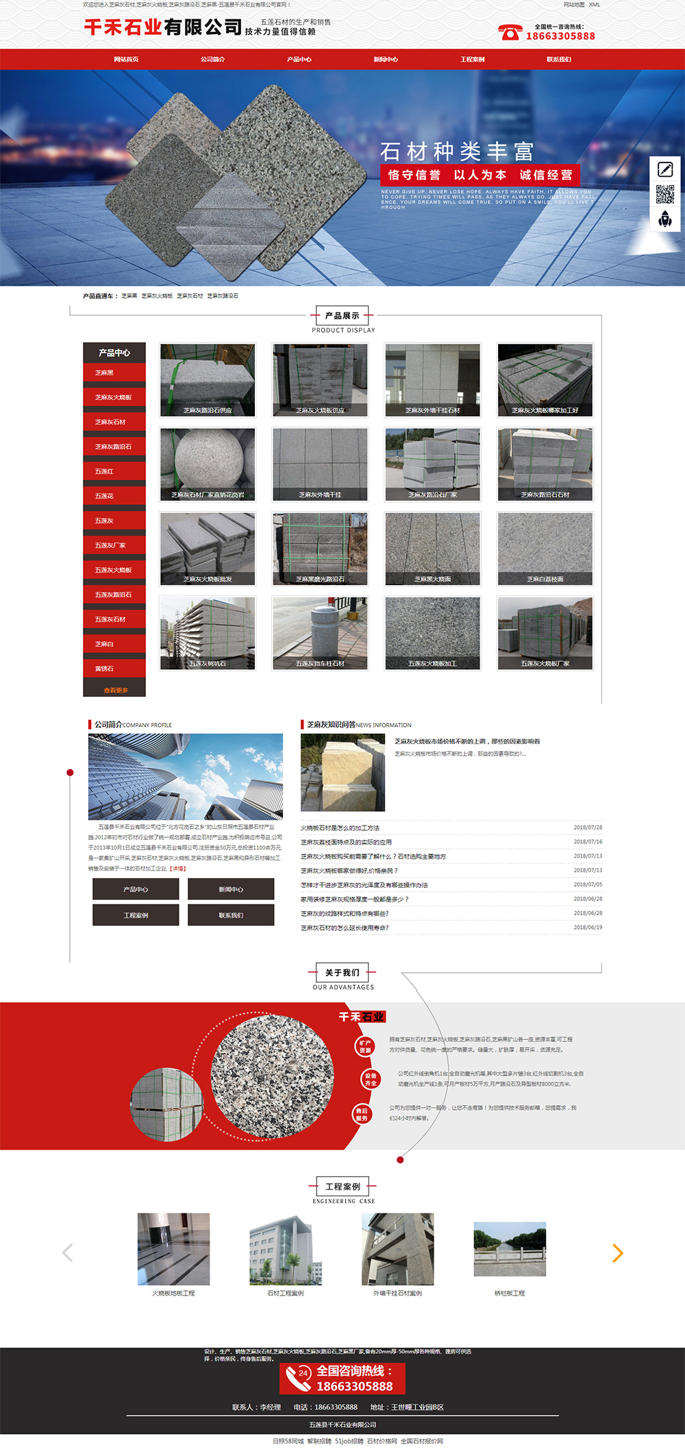 • 五蓮縣千禾石業(yè)有限公司位于"北方花崗石之鄉(xiāng)的山東日照市五蓮縣石材產(chǎn)業(yè)園(電話:18663305888).2012年初市對(duì)石材行業(yè)做了統(tǒng)一規(guī)劃部署,成立石材產(chǎn)業(yè)園.為積極響應(yīng)市號(hào)召,公司于2013年10月1日成立五蓮縣千禾石業(yè)有限公司.注冊(cè)資金50萬(wàn)元,總投資1100余萬(wàn)元,是一家集礦山開采,板材,路沿石,五蓮灰,五蓮花,五蓮紅板材及各種路沿石和異形石材等加工銷售及安裝于一體的石材加工企業(yè). 公司擁有豐富的礦產(chǎn)資源,作為五蓮灰廠家,生產(chǎn)山東五蓮花,五蓮灰石材等石材產(chǎn)品,其中擁有當(dāng)?shù)負(fù)碛形迳徎业V山一處,公司